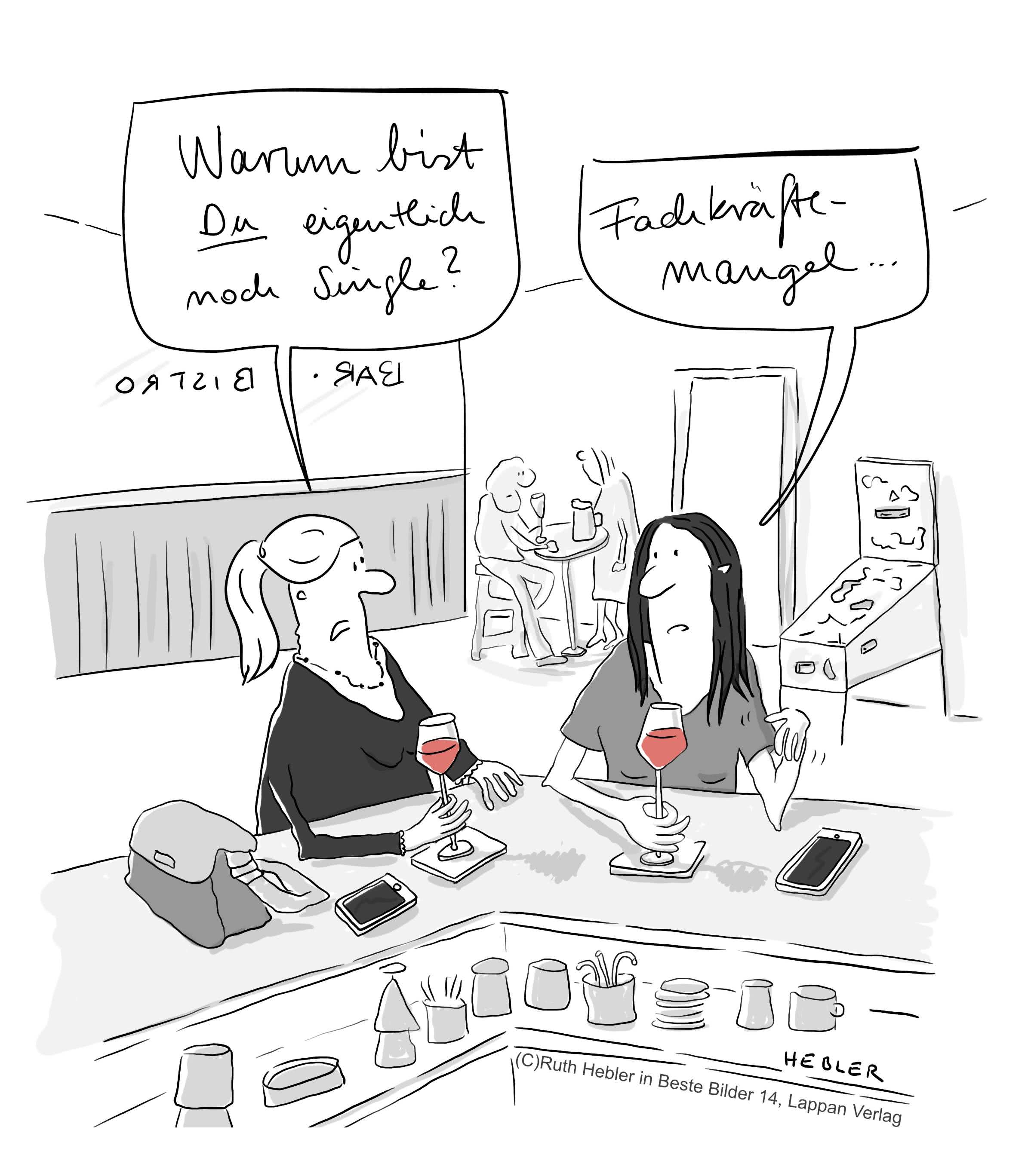 BEGRÜNDUNG DER JURY: Zwei Freundinnen am Tresen unterhalten sich immer über Beziehungen, genauso wenig überraschend ist, dass dabei besonders die Probleme angesprochen werden. Und doch überrascht Ruth Hebler in ihrem Cartoon mit einer gelungenen Pointe. Denn sie kombiniert die Beziehungsthematik mit einem hochaktuellen Wirtschaftsproblem, dem Fachkräftemangel. Dadurch schafft sie einen sehr guten Witz. Die Antwort der Single-Frau macht auch gleich deutlich, wo deren Beziehungsproblem liegen könnte: Dank Dating-Apps sind nicht nur die Auswahlmöglichkeiten, sondern auch die Anspruchshaltung möglicherweise eine Nummer zu groß. Sehr schön fand die Jury außerdem die zeichnerische Umsetzung, die mit wenigen Farbakzenten und reduziertem Strich die Aufmerksamkeit auf die beiden Protagonistinnen lenkt.