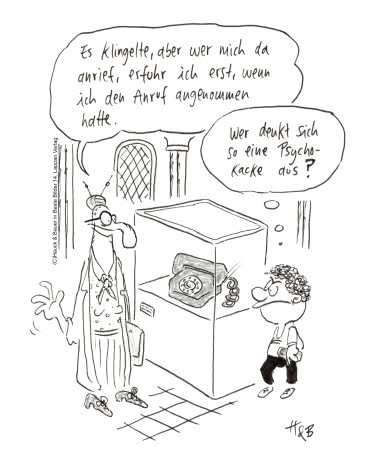 BEGRÜNDUNG DER JURY: Kommunikationskultur entsteht immer auch mit den technischen Mitteln, die dafür zur Verfügung stehen. Museal ist inzwischen das Telefon mit Wählscheibe aus dem vordigitalen Zeitalter, ohne Display und mit dem Klingeln exakt einer akustischen Information, wenn jemand in Kontakt treten wollte. Die technischen Gegebenheiten und die Kosten eines Gesprächs sorgten aber dafür, dass ein Anruf nicht als Zumutung wahrgenommen wurde. Zumal – und hier kommt eine zweite wichtige Ebene des Cartoons mit ins Spiel – man damals geübter waren im direkten Dialog, war doch die einzige Alternative dazu der Brief. Insofern kann der Cartoon auch als Kritik an der modernen, social media gestützten Kommunikation inklusive der schnell überhitzten Debatten-un-kultur gelesen werden, gelebt und als „Psychokacke“ gedacht vom jungen Protagonisten. Bei aller gesellschaftskritischen Relevanz des Themas ist der Cartoons aber auch eines ganz besonders: lustig!